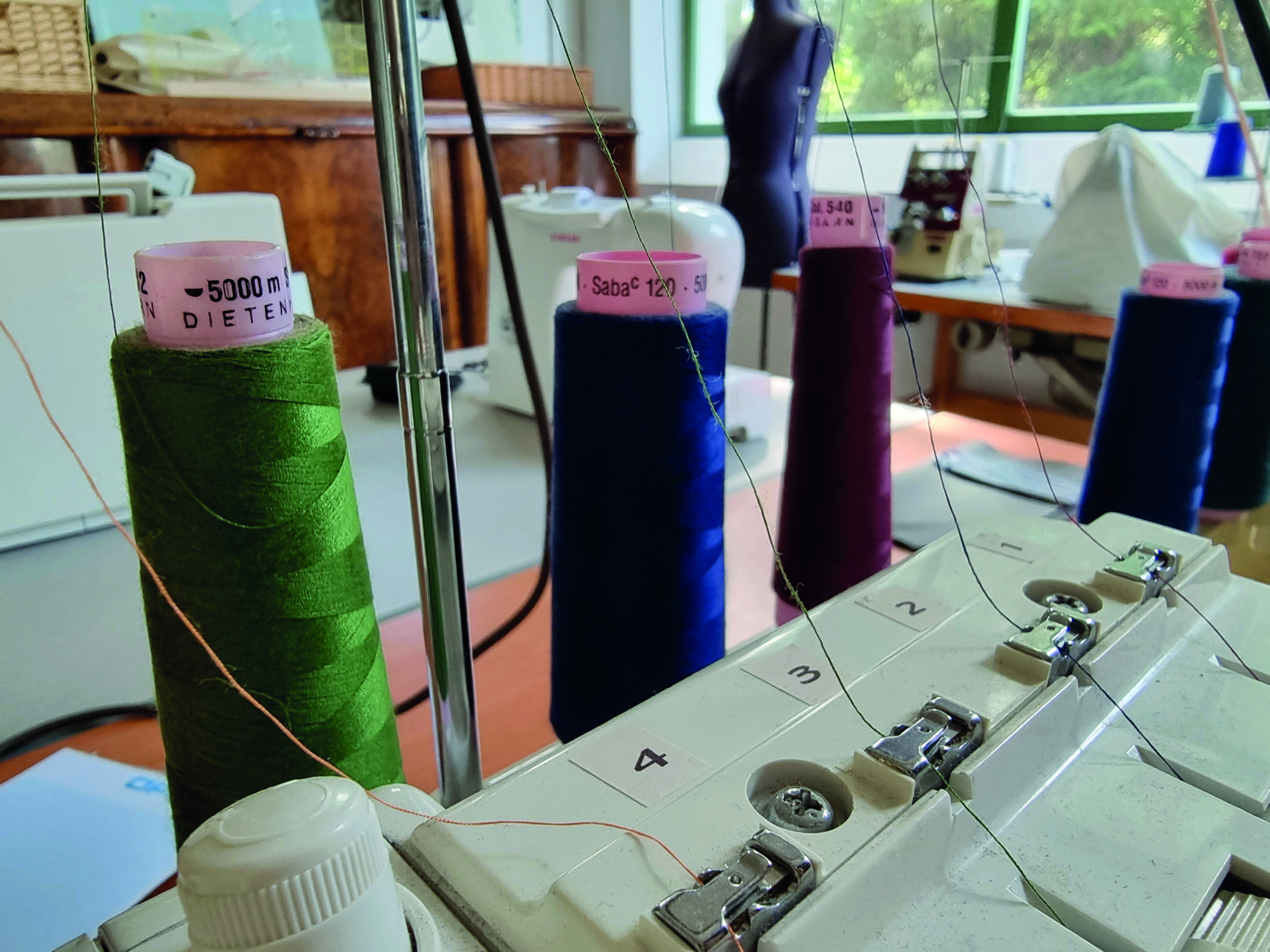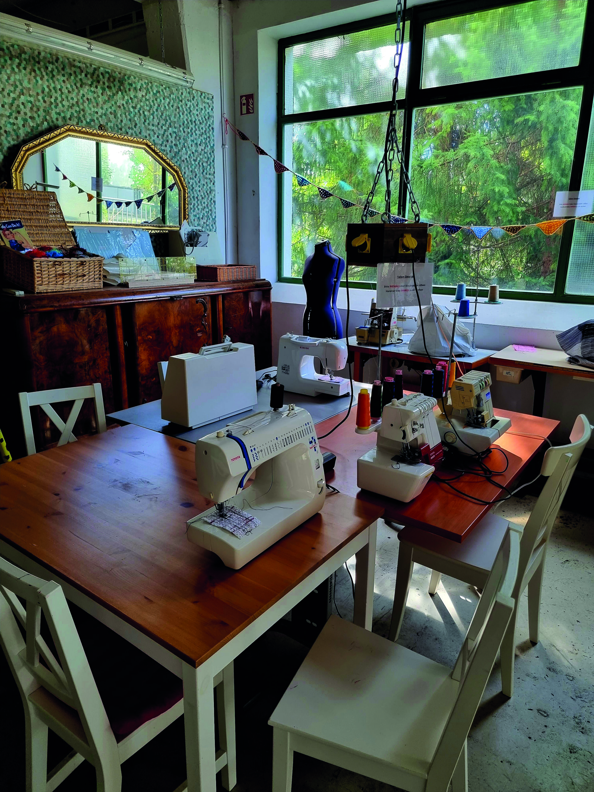 Wir bieten verschiedene Nähmaschinen, darunter auch Over Lock-Maschinen, die dir ein professionelles Nähergebnis ermöglichen. Große Tische stehen bereit, perfekt zum Zuschneiden, Abstecken und Vorbereiten deiner Stoffe.